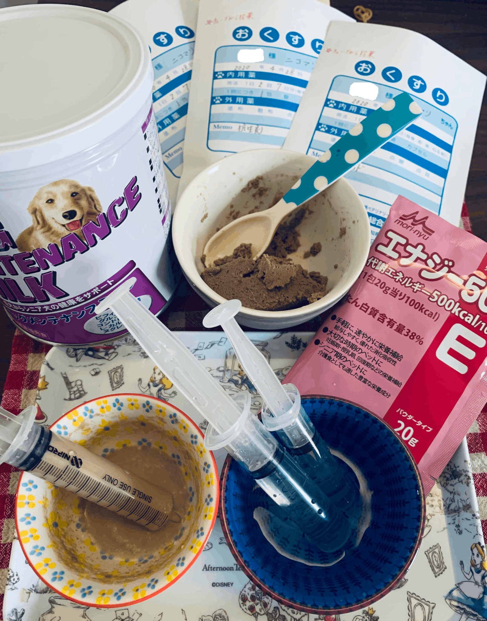 水10cc→流動食→薬入りの水(朝晩)→水15ccをセットに、日に4〜6回あげてます!