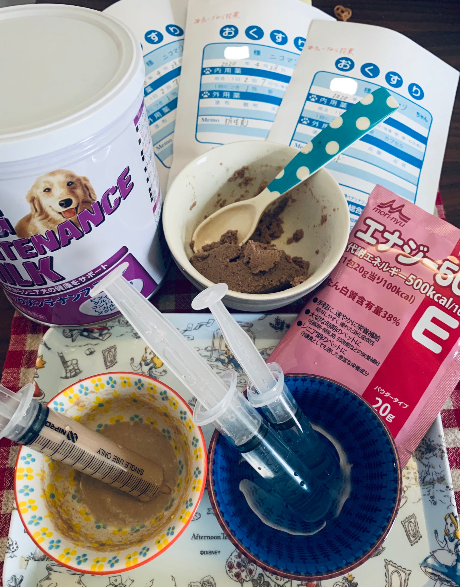 絶食中の為全部お腹のチューブから…。水10cc→流動食→薬入りの水(朝晩)→水15ccをセットに、日に4〜6回あげてます!ニコマリには胃チューブが合わないみたいで、あげると痛みで震えます…。(一時的な為健康上問題は無いそうです)胃チューブを始めてから1週間が経ちました。何とか1ヶ月くらいで外せますように…★