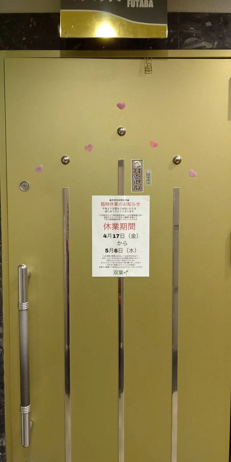 新型コロナウイルスの感染拡大防止の為双葉は営業を自粛する決断に至りました。