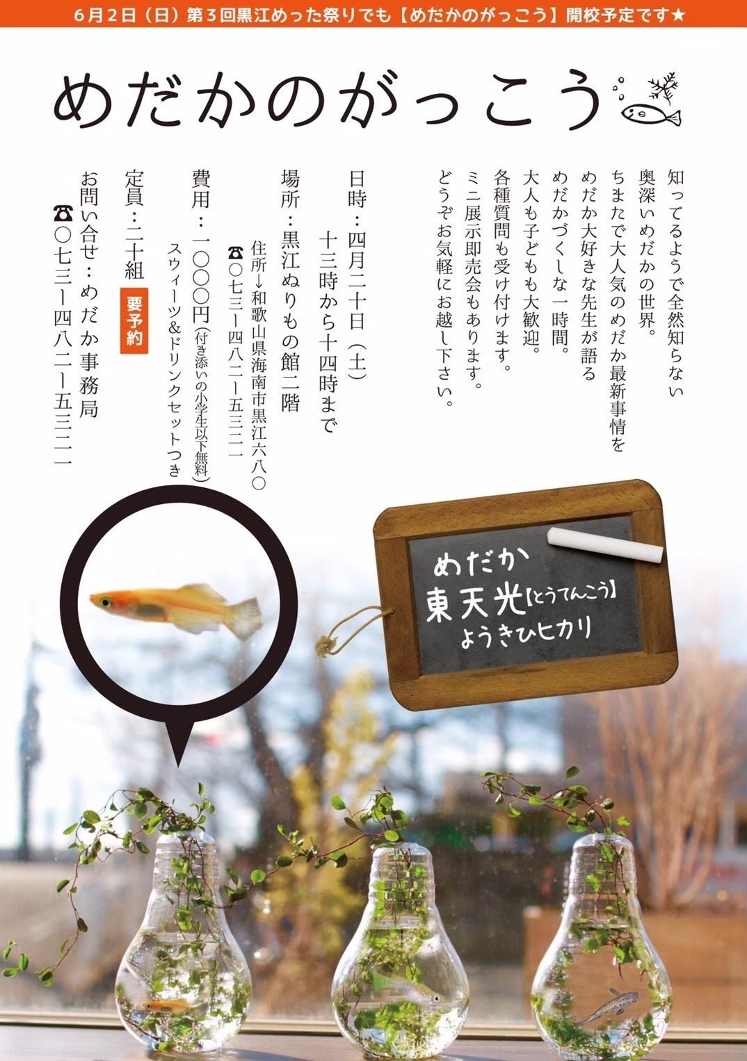【めだか救い】に関しては、心苦しいのですが新型コロナウイルス感染拡大防止の観点で、支援者は和歌山県内在住者のみとさせていただきます。また引き渡しは混雑を回避するため予約制での対応にご協力ください。