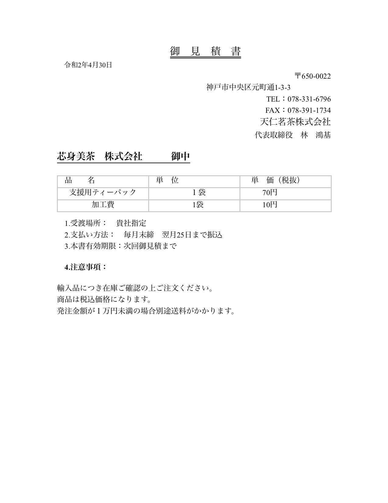 支援用ティーパックの茶葉代と加工費の見積もりを、お茶の仕入れ先の天仁茗茶様から出していただいています。支援用ティーパック茶葉代70円+ティーパック加工費10円=80円が支援用ティーパック1つあたりのコストです。こちらに郵送代などを考えると 100円/支援用テーパック くらいが一番最適な価格かと思っています。