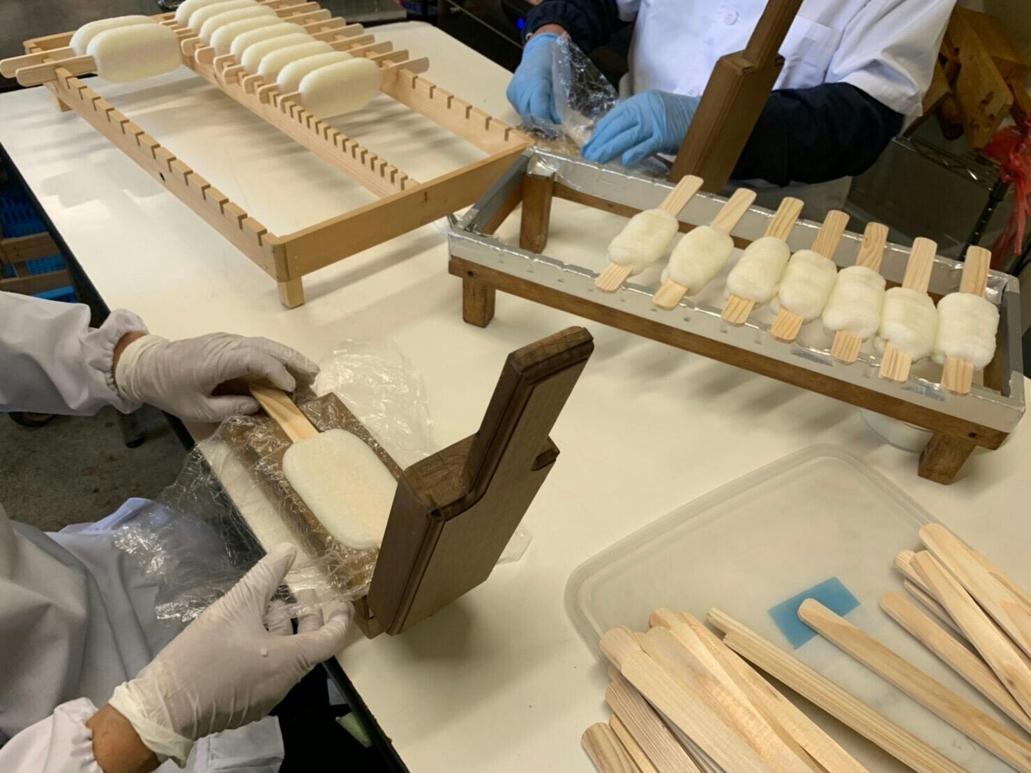 お米は標高1000mの山に囲まれた寒暖差の激しい盆地で栽培し、籾撒き(もみまき)から田植え、刈り取り、製造まで全て自社でおこなっています。香り豊かでツヤが自慢のお米です。五平餅は創業以来変わらない独自の製法で、一本一本手作りで製造しています。