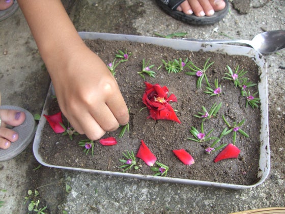 どろんこ遊びをして、みんなで協力して、「チョコレートケーキ」を作りました。