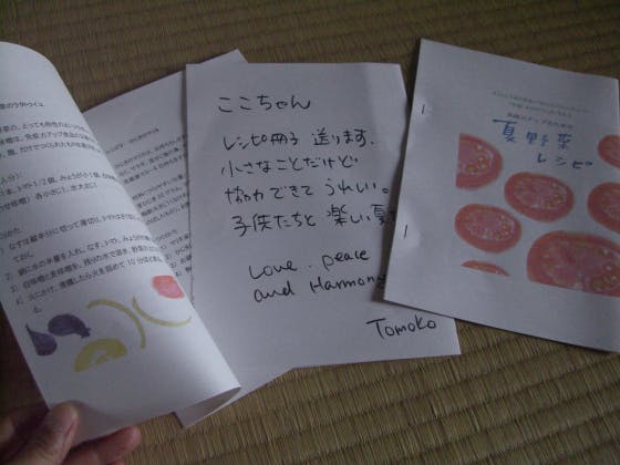 15000円以上支援して下さったパトロンの皆様には、8月に入ったら野菜セットをお送りするのですが、今日はセットにつける「免疫力アップレシピ」が届きました!マクロビ料理の先生のTOMOKOさんと、イラストレーター和田純さんとのコラボ作品で、とてもあたたかい手作り冊子♪。パトロンのみなさま、乞うご期待!そして「おいでプロジェクト」まだまだ支援金、受け付けていますので、「野菜セット欲しい!レシピもつけて!」という方、よろしくお願い致します!