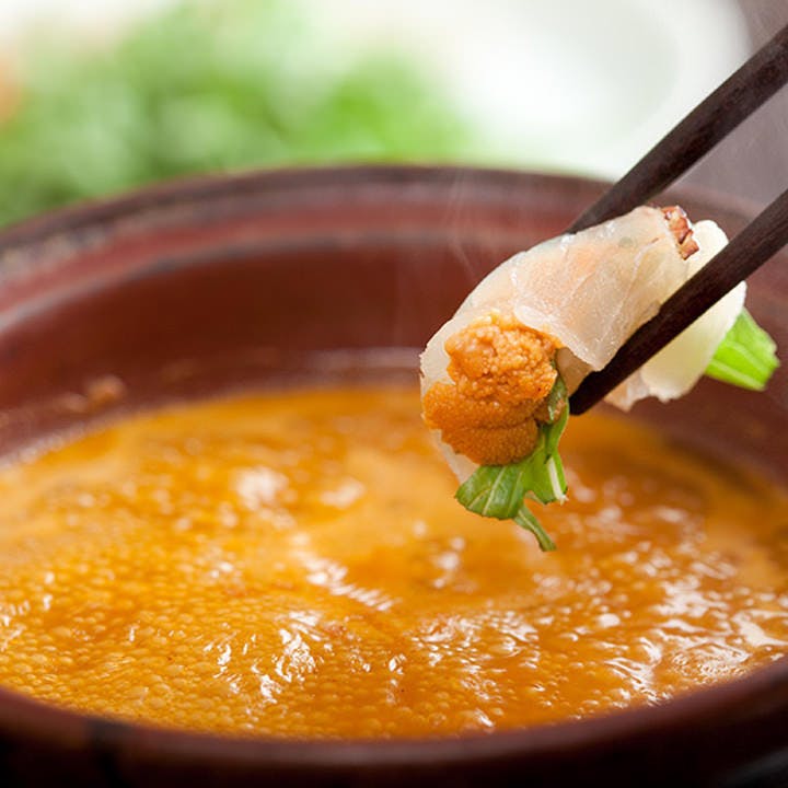 当店の代名詞ともいえる「うにしゃぶ」は旬のお魚や海老を無添加の生うにを