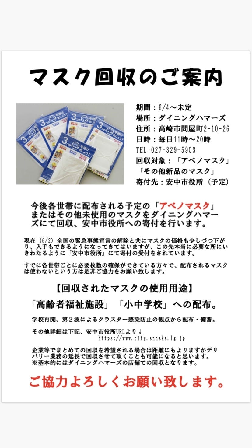 ①『アベノマスク・未使用のマスクの回収・寄付』を現在テイクアウト・デリバリー営業を行っている「ダイニングハマーズ」で開始致しました。