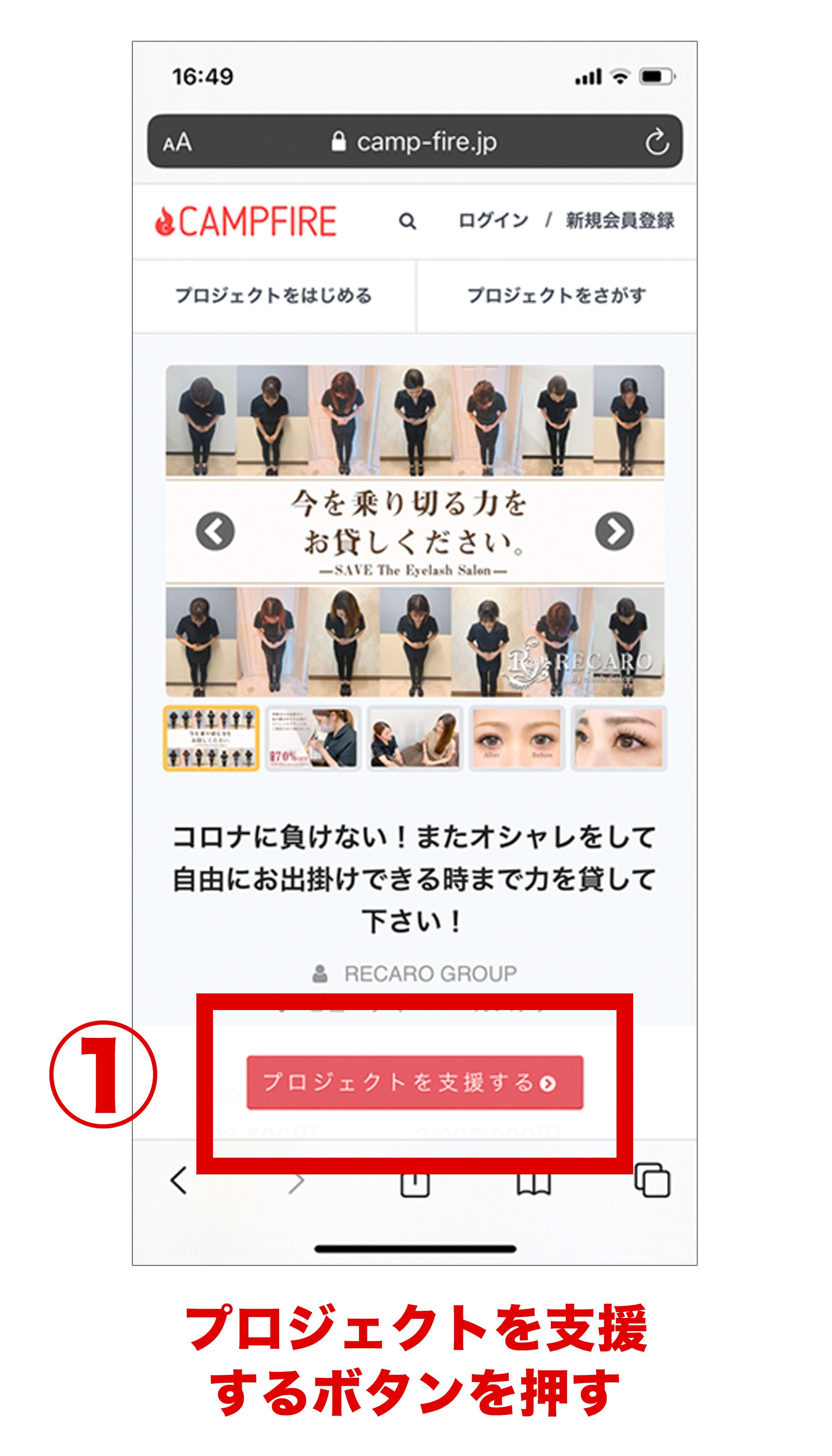 1.まずRECAROのクラウドファンディングページから「プロジェクトを支援する」ボタンを押してください。