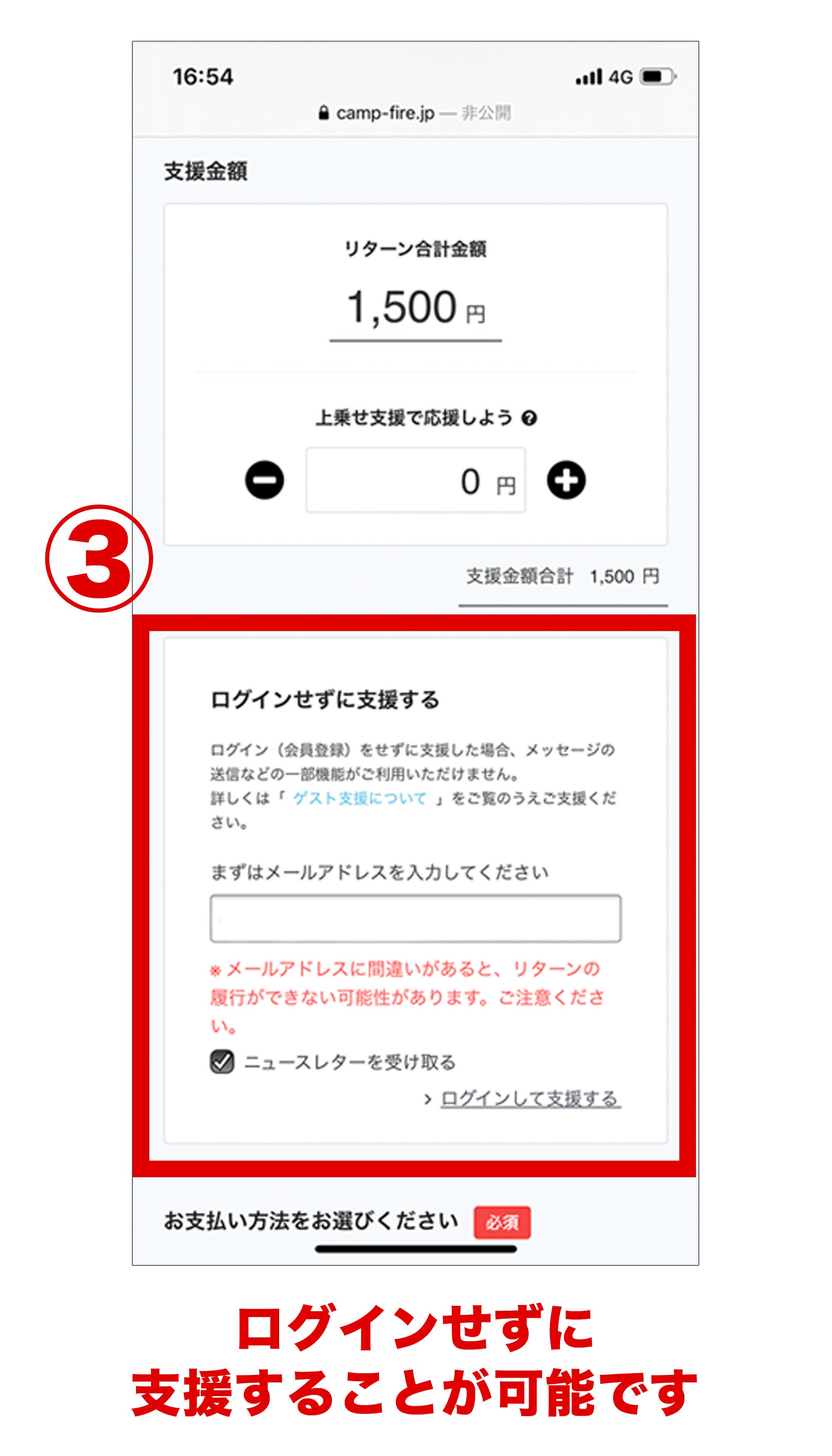 3.ログインせずに支援する箇所にメールアドレスの入力をお願いします。