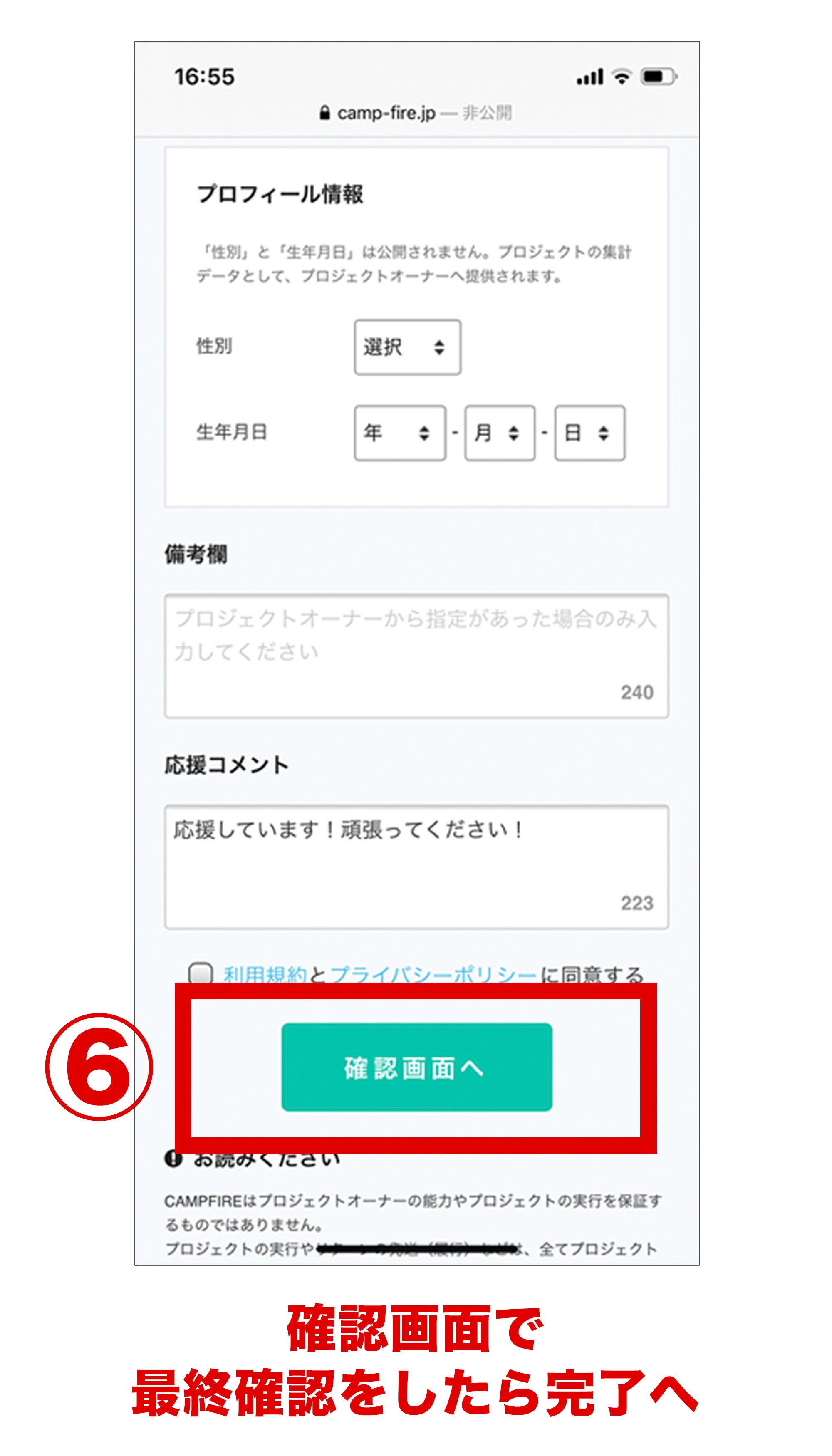6.最後に「利用規約とプライバシーポリシーに同意する」をチェックし、確認画面で最終確認をしたら完了です。