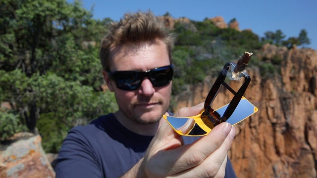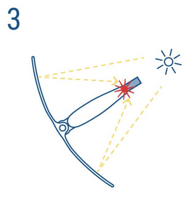 太陽の方に向け、燃料に光の焦点を合わせます。(すぐに煙が出てきます:約3秒)火種が安定するまで焦点を合わせ続けます。(約10秒)