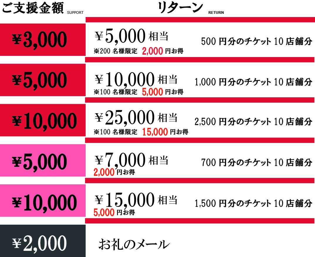 リターン→(各店舗で使用出来る商品券/お食事券 10,000円分)