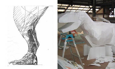 遡ること2003年。私は、博物館に納める造形物や巨大でリアルな壁画などを創りだす”造形壁画”業を営んでおりました。同年夏に、ある有名恐竜映画の展覧会が開催をされ、私はそれを観覧に行きました。そこには、ロボットの恐竜や映画撮影で実際に使われた恐竜のフィギュアなどが展示されていたのですが、しかし、何かが物足りない…。