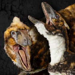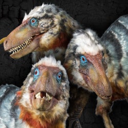 今では一般的になっている「羽毛に覆われたラプトル」。ビジュアルは、現在生きている大型の鳥類たち(ヒクイドリ、エミュー、ツメバケイ等)のイメージを参考にしております。求愛ダンスや抱卵行動など、他の恐竜にはない独特のしぐさをするのも特徴です。