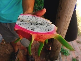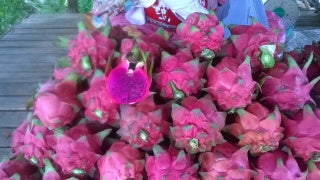 多肉植物。濃いピンク色の果皮が強烈だ、味はさっぱり。水分補給に。果実がピンクのものもある。