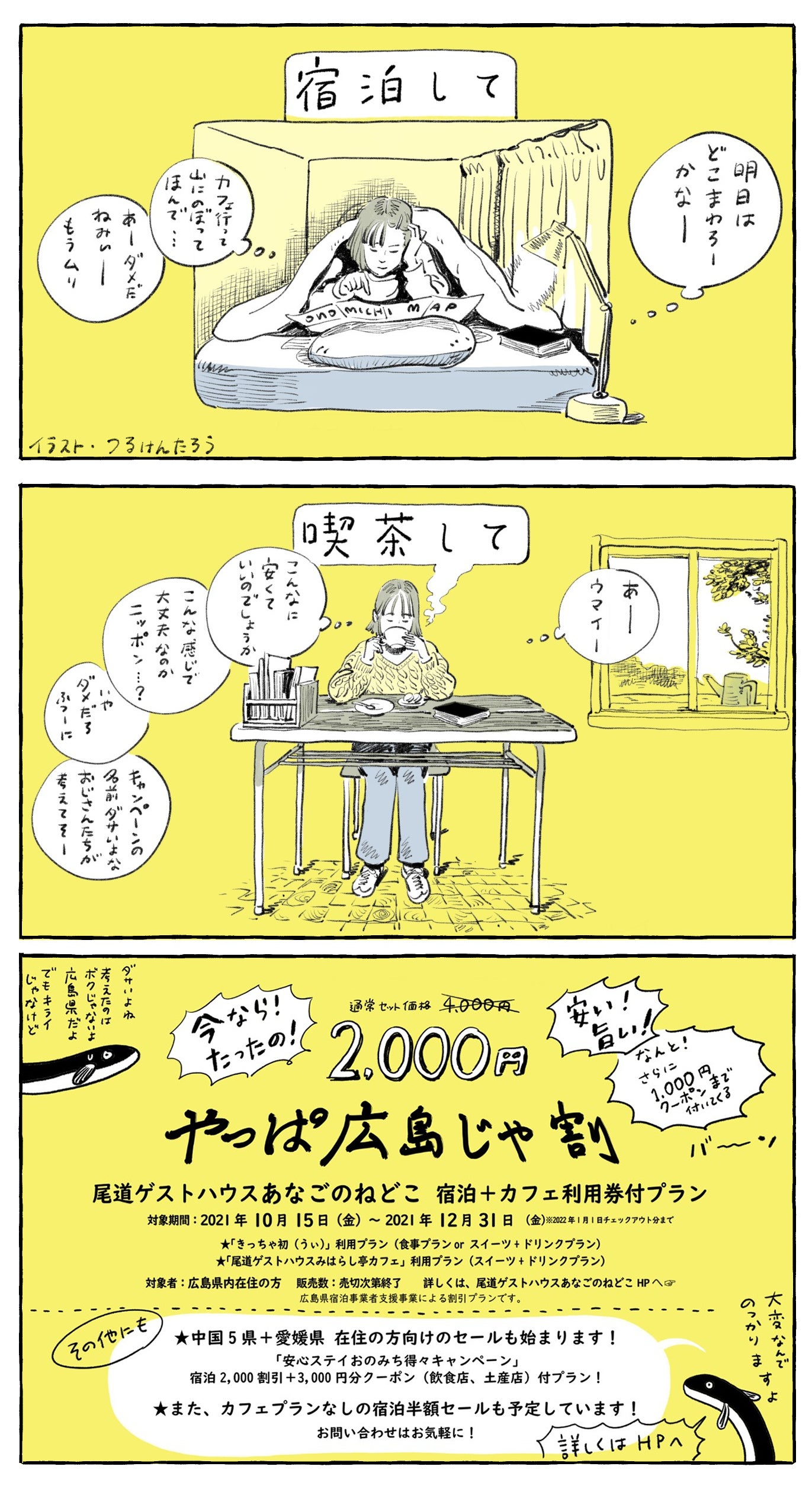 こんにちは。あなごのねどこの寝床長つるです。最近、「日本人以外は麺をすすらない」という、いまさらあまり興味もわかない定番のお話の、とある誰かの考察で、「口と料理(器を含め)が繋がったままの状態が続くのをあまり良しとしない文化」(適量で噛み切る) が他国にはあり、そういう生理感も理由の中の一つにあるんじゃないか、というようなことを書いていて、その真偽は置いておいて、確かに日本では麺類を食べる時って、人間の口と料理と器がものすごく「つながっちゃってる」なあと、とても可笑しく思えてきました。自分の中でも長い間「すする」という言葉表現に引っ張られた話題になっていたので、この「つながっちゃってる」の視点がやたらと楽しいものになりました。時々尾道のラーメン屋の風景でも、ええ感じのおっちゃんが、おいおいそれじゃ3口くらいで食べ終えちゃうんじゃないの?というような量の麺を箸で掴み、一気にずずずずずずとすすっていますが、おっちゃんとラーメン丼ぶりがその太い幹のような麺の束で、まさに「つながっちゃってる」のを見かけます。まるで妖怪が丼ぶりから霊魂を吸い取ってるようであり、店を出ていくおっちゃんの満足げな生気あふれる姿をみると、なんだか可笑しな儀式のようでなごみます。ここまで全くなんの関係もない話をただ書きました。ただ書きました。すみません。はい、そして本題のお知らせですが、(ただ宣伝だけをするのが嫌だった)----------------------------------------------------------------------------------------現在、あなごのねどこと、姉妹店のみはらし亭では、★中国5県および愛媛県にお住まいの方に、とってもお得のキャンペーンをやっております!!!めちゃくちゃお安くなっております!「宿泊+カフェ利用」がたった2000円とか「宿泊2000円引+飲食店クーポン2000円分+お土産店クーポン1000円分」とかもはや、わやくそ状態のキャンペーンです。在住地の対象者の方、そうでない方も、お友達に知らせてあげていただけたら嬉しいです!詳しくはこちらからどうぞ↓http://anago.onomichisaisei.com/?page_id=1252以上あなごのねどこ寝床長のつるけんたろうでした。お待ちしてます。