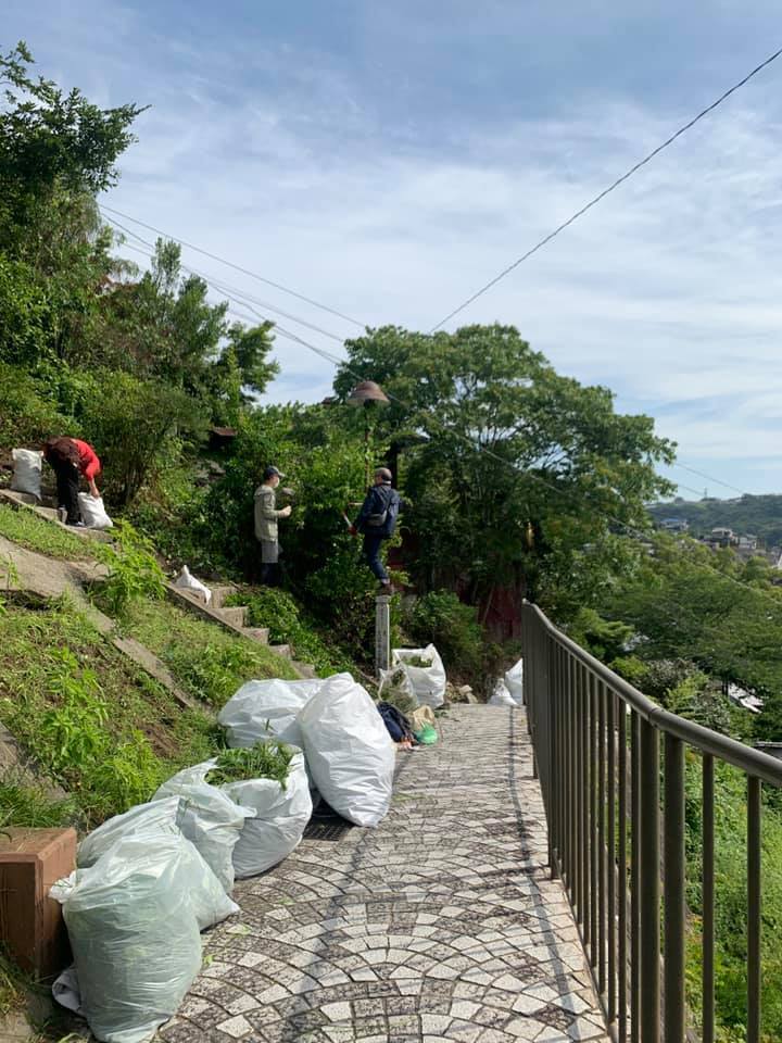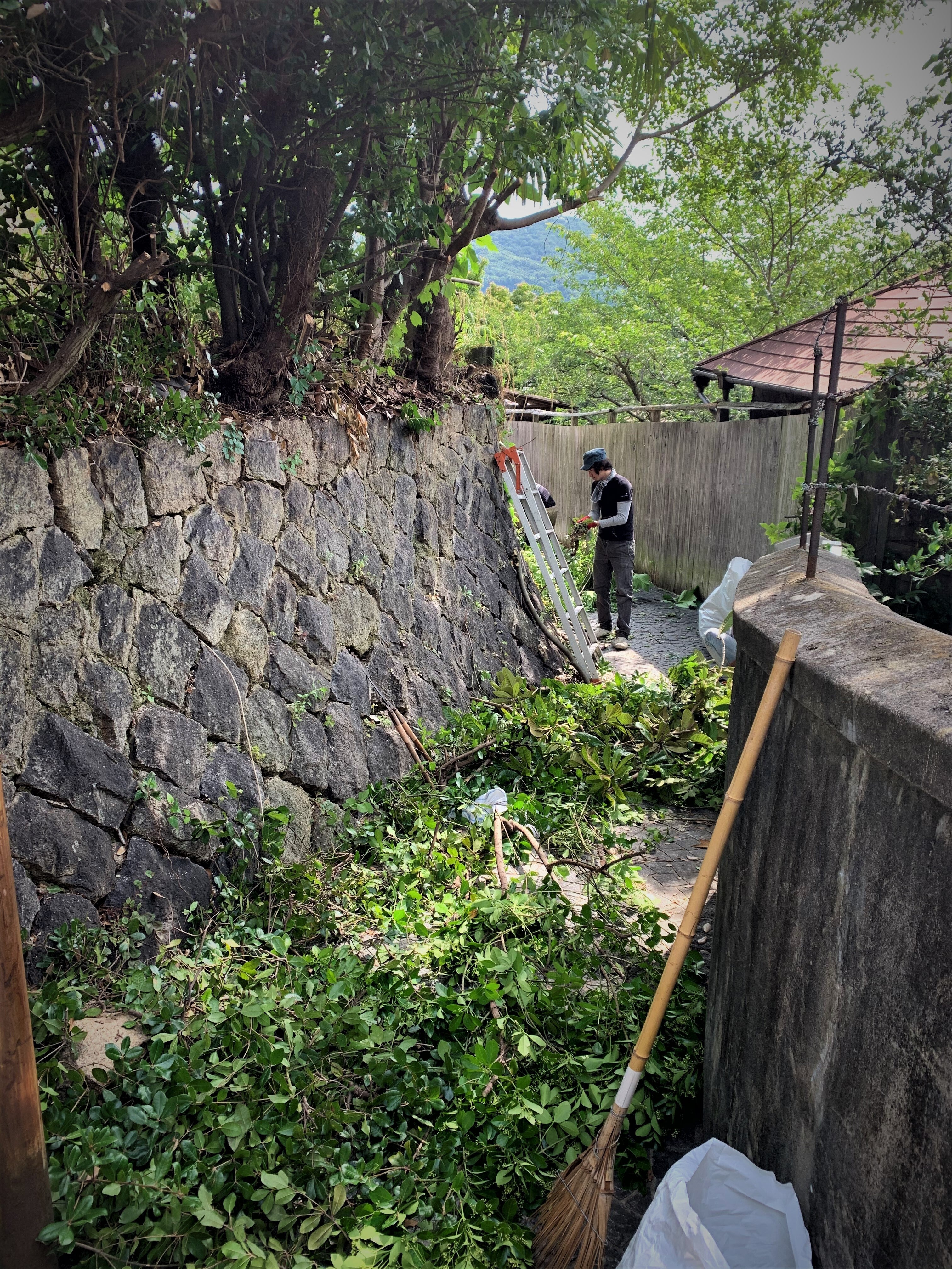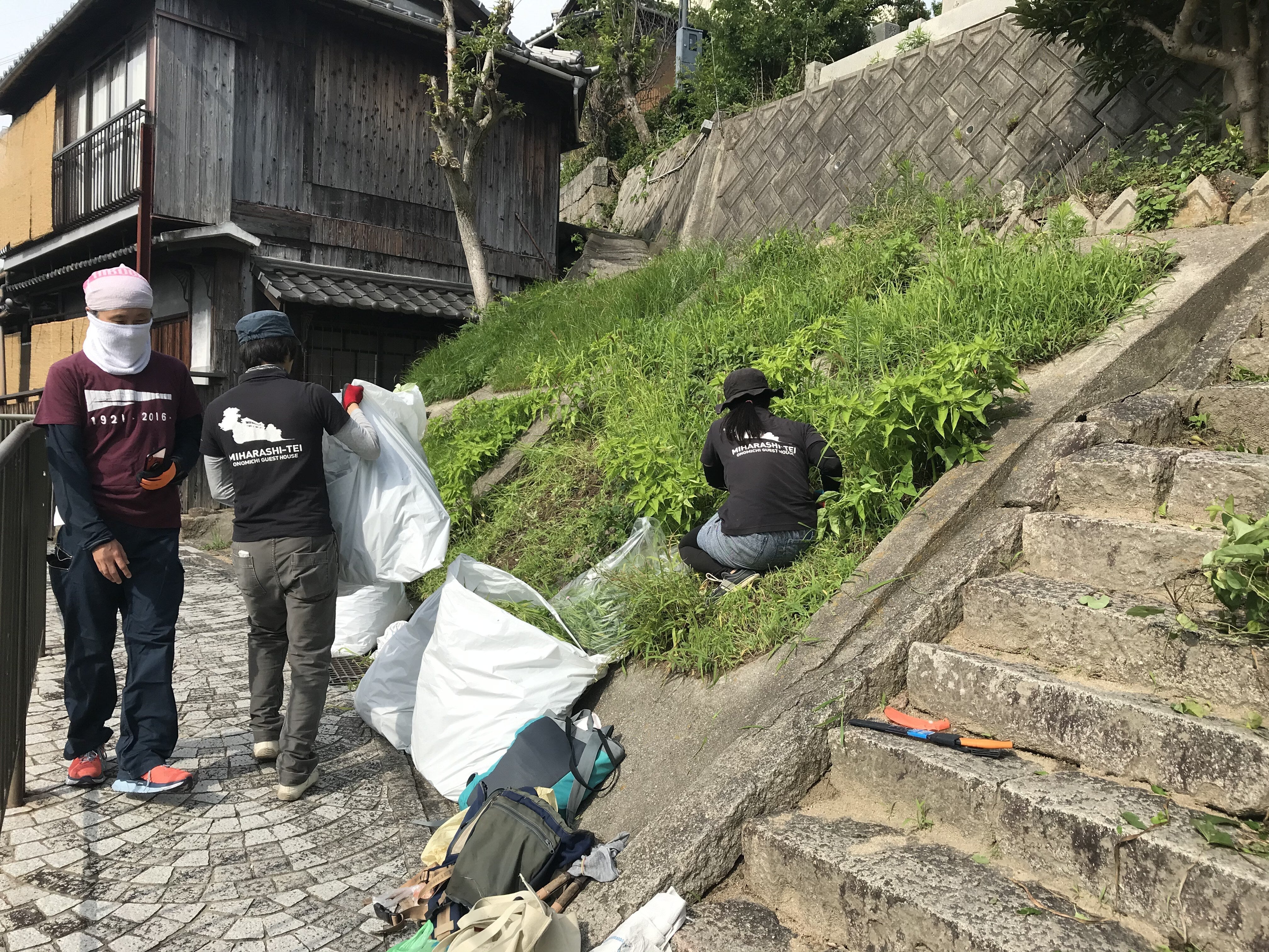 Miharashi-tei is in Higashitsuchidocho, Onomichi. We are a part of a local community group for the area. It is also where Senkoji temple is located, so many tourists also walk around. Every year in June, all residents get together and clean the area, mainly weeding, digging dirt and carry them down the hill. With the NPO Exec. Director Masako Toyota along with four staff members, we worked with our neighbors for about 2 hours on June 21st. It was very tiring, but a great opportunity for us to reconnect with the residents of the area.