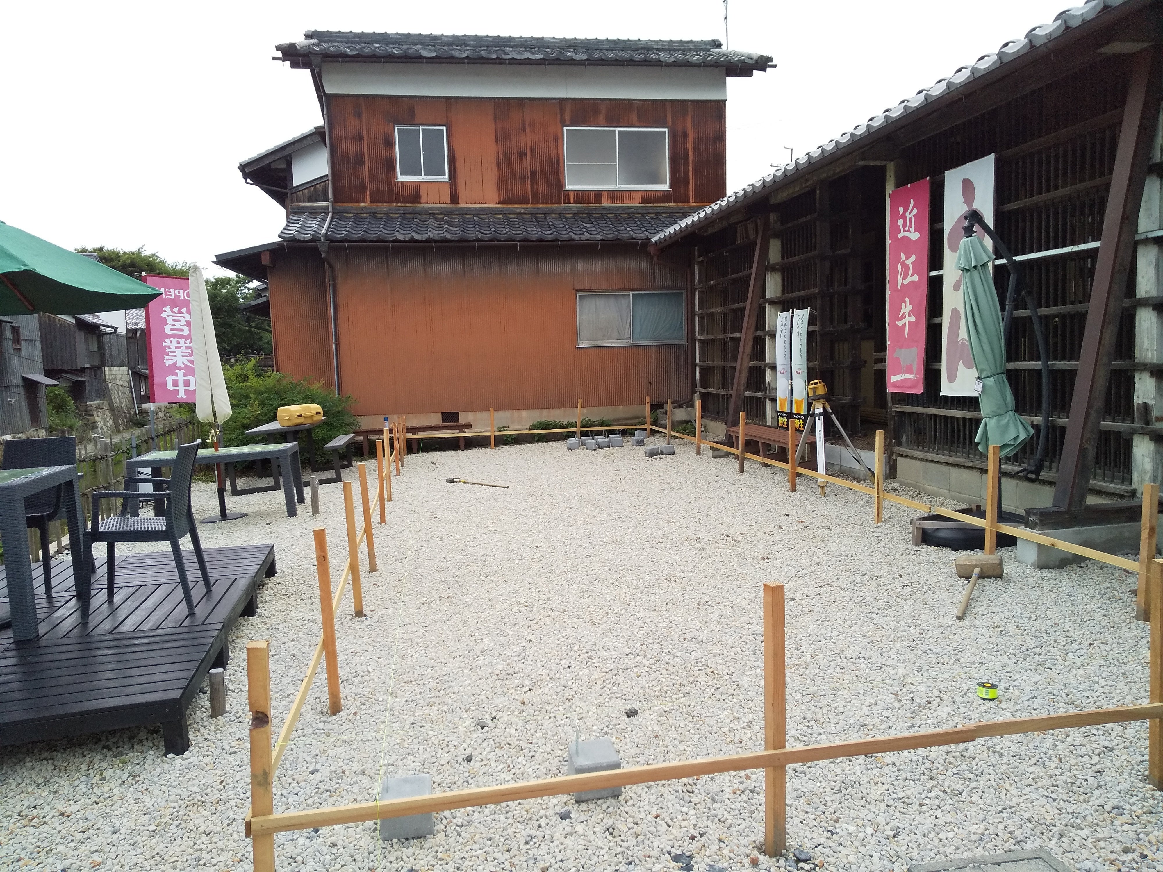 皆さま、お久しぶりです。ほりかふぇ店長の小出です。各地で大雨被害が出ていますが、滋賀も今朝方かなり強い雨が降っていました。日中は雨も上がり、ようやく、テラスのデッキ&サンシェードを取り付ける工事が始まりました。雨上がり後で湿気ムンムンの中、業者さんも汗だくで頑張ってくれました。引き続き、進捗状況をご報告させていただきます。梅雨らしい天気が続いていますが、皆さま、くれぐれも体調にお気をつけください!