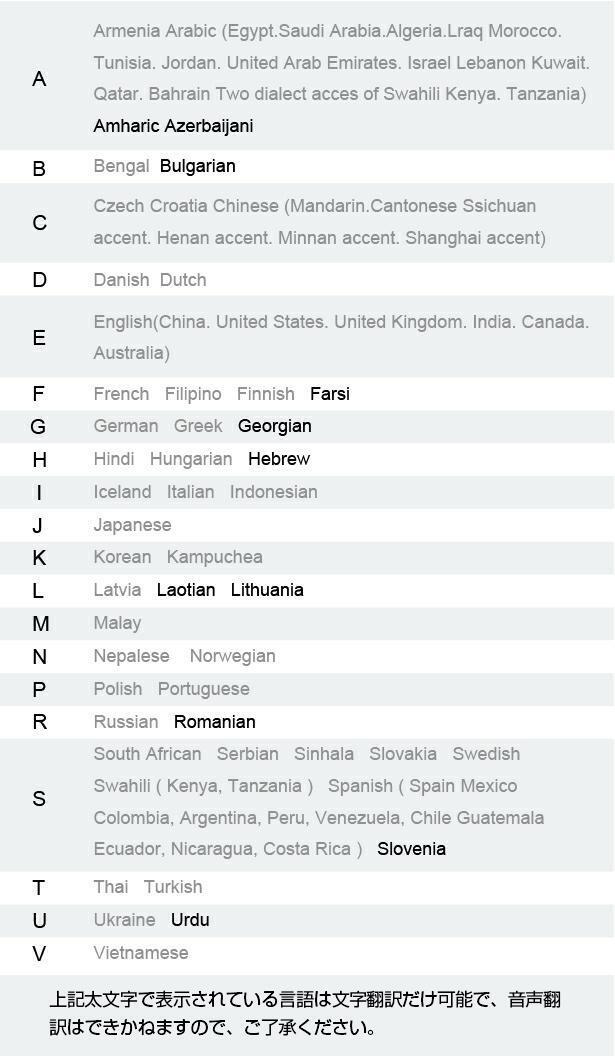 現在8個言語(アゼルバイジャン、アムハラ語、ペルシャ語、グルジア語、ラオス語、リワノ語、ウルドゥー語、ウルドゥー語)が対応できません。