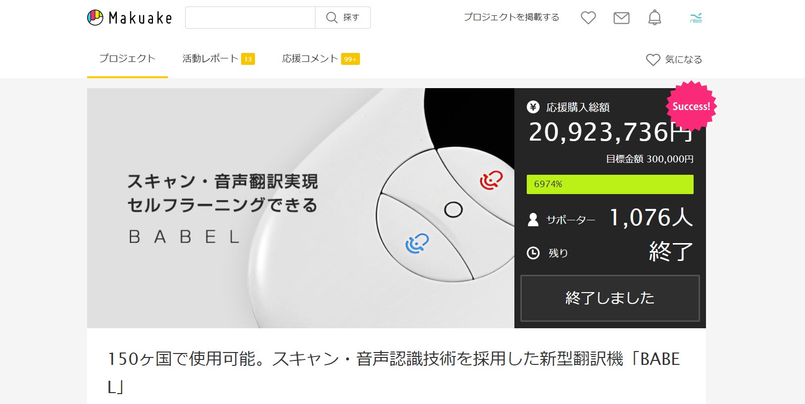 2020/06/29 11:37ご支援の皆様へ昨日まで150ヶ国で使用可能、スキャン・音声認識技術を採用した新型翻訳機「BABEL」クラウドファンディングは終了させていただきました。皆様の おかげで「BABEL」は60万円を突破し、弊社のアイディアに多くの方から共感を頂き、心から感謝しております。これからも随時、活動レポートにて進捗情報を更新してまいりますので、予定通りに、サポーターの皆様の手元にお届けできるよう、努力いたします。お楽しみにお待ちいただきますよ、お願い申し上げます。引き続き「BABEL」をどうぞよろしくお願いいたします。Mercuryチーム一同 もっと見る【お礼】目標金額120%達成しました!