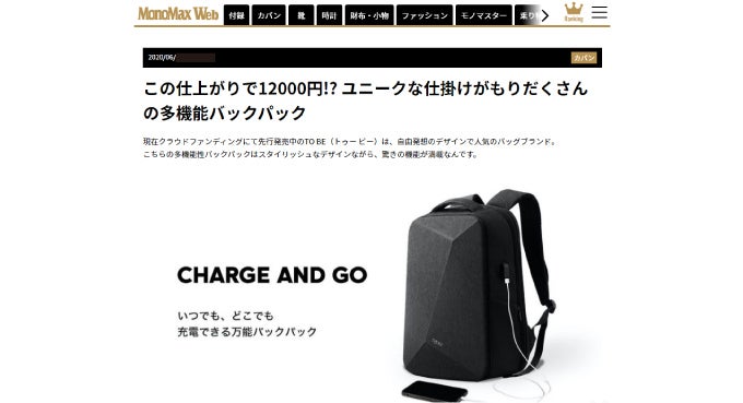 いつも有難うございます。この度、MonoMax WEBにて「TOBE」を掲載いただきましたのでご報告させていただきます。https://monomax.jp/archives/74738/ このことでもっと皆様に知っていただきご興味お持ちいただければ嬉しく存じます。プロジェクトも残り27日間となりました。この商品をもっと多くに方々に知っていただきたいと思っておりますので、最後までよろしくお願いいたします。TOBEプロジェクトスタッフ一同