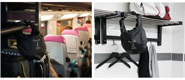 ⑦ カフェの椅子に取り付けて貴重品を入れておけば、トイレや電話で席を外すときも安心!