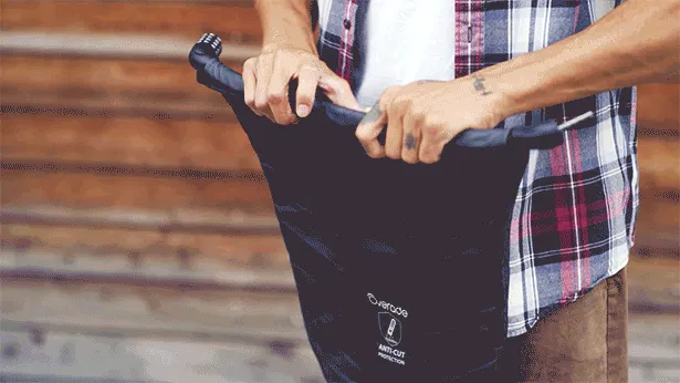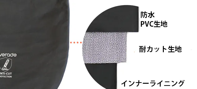 バッグの第2層は、ガラス繊維、ポリエステル、高分子量ポリエチレン (UHMWPE) をブレンドした耐カット生地。パネルは特殊なUHMWPE素材の糸で縫い付けられ、刃物による盗難の被害から保護します。