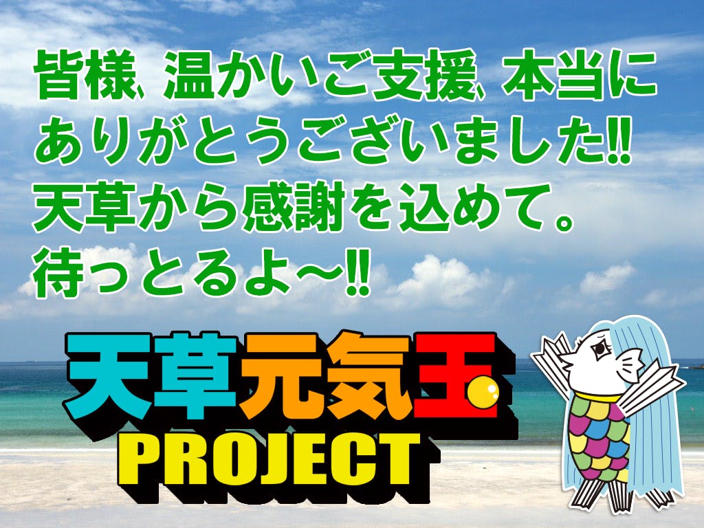 2020/06/29 00:005/20にスタートした天草元気玉プロジェクトが無事終了いたしました。スタートから10日ほどで目標金額を、そして最終日にNEXT GORL の1000万を達成しました。不安を抱えながらのスタートでしたが、天草を応援してくださる方々の温かい言葉や支援が元気玉となって私たちに届き、大きな力になりました。まだまだコロナの不安は去ったわけではありません。しかし天草に心を寄せてくださる方が全国にいてくださるという力を実感しています。天草の発展の一助となるよう、これからもオール天草として力を合わせて頑張っていこうと思います。応援してくださった皆様へ参加店を代表し心から感謝申し上げます。ありがとうございました。お会いできる日を心から楽しみにしております。天草元気玉プロジェクト 代表 苓州屋 中西英雄天草元気玉プロジェクト事務局の蟻正です。コロナで疲弊した事業者を少しでも支えたい、元気したいとの一心で事務局を担当しました。しかし、多くの支援者様や参加店舗のみなさまから応援や感謝のお言葉を頂く中で、自分自身が逆に勇気づけられ励まされていることに気が付きました。このプロジェクトを通して支援者さま、参加店舗の方々とのご縁を頂き、想いが形になる瞬間に立ち会うことができたのは一生の財産です。天草を応援してくださり誠にありがとうございました。皆様にお会いできるのを心待ちにしております。 <事務局よりお知らせ>ご購入いただいた「あまケン」は7月10日前後にお手元にお届けできる予定です。万一、7月後半になっても届かない場合はメールもしくはお電話でご連絡ください。尚、「支援完了メール」が届いていない、振込などが完了していない、などの理由で購入できていない場合もございます。まずはご確認の上、お問い合わせいただきますよう、お願いいたします。 もっと見る