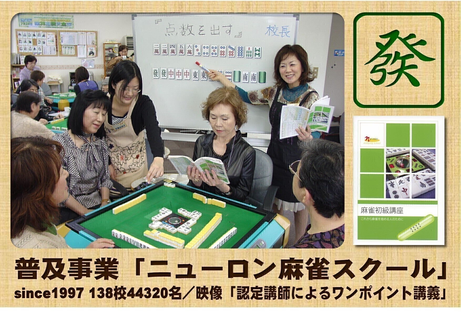 統括する麻雀教室ブランド「ニューロン麻雀スクール」では、小学生から90代の方まで、健全な趣味としての麻雀を覚えて楽しめる機会を様々なスタイルで提供。1997年からの24年間で138校44320名、年間動員21万人の事業規模となっています。