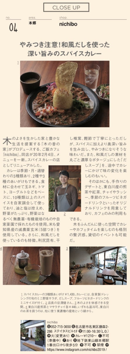 nichiboのカレーはすべて香辛料からシェフが調合した手づくり。一般的なカレーでよく使われる、化学調味料、着色料、合成保存料などは一切使用していません。