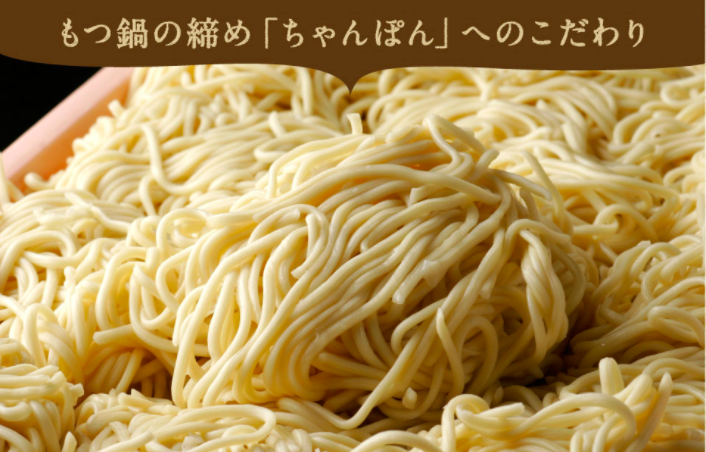 実は楽天地はもつ鍋の締め、ちゃんぽん発祥のお店。煮込んで美味しくなるように独自の製法で作られた、もつ鍋にぴったりの中太麺。スープと絡まって締めでもさらに食がすすむおいしさです。