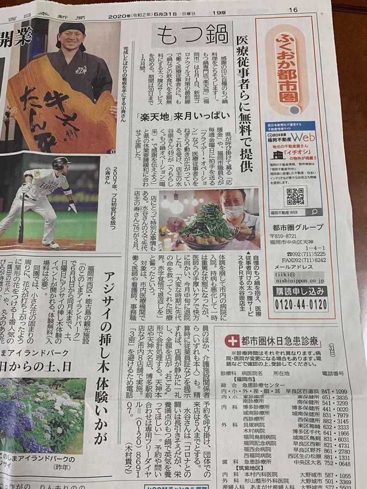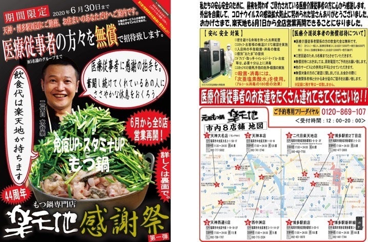 6月1日〜6月30日までの1ヶ月間、福岡市内の8店舗にて、医療従事者の方々を対象にもつ鍋を無償提供致します。