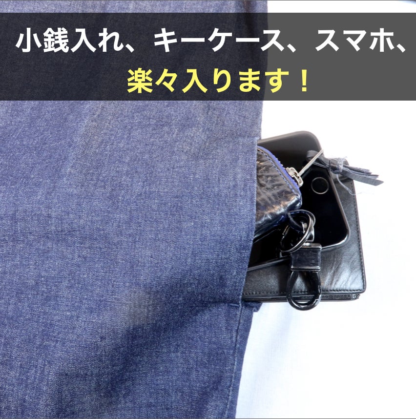 ポケットの収納力は、長財布・スマホ・小銭入れを入れても余裕で入るよう設計。