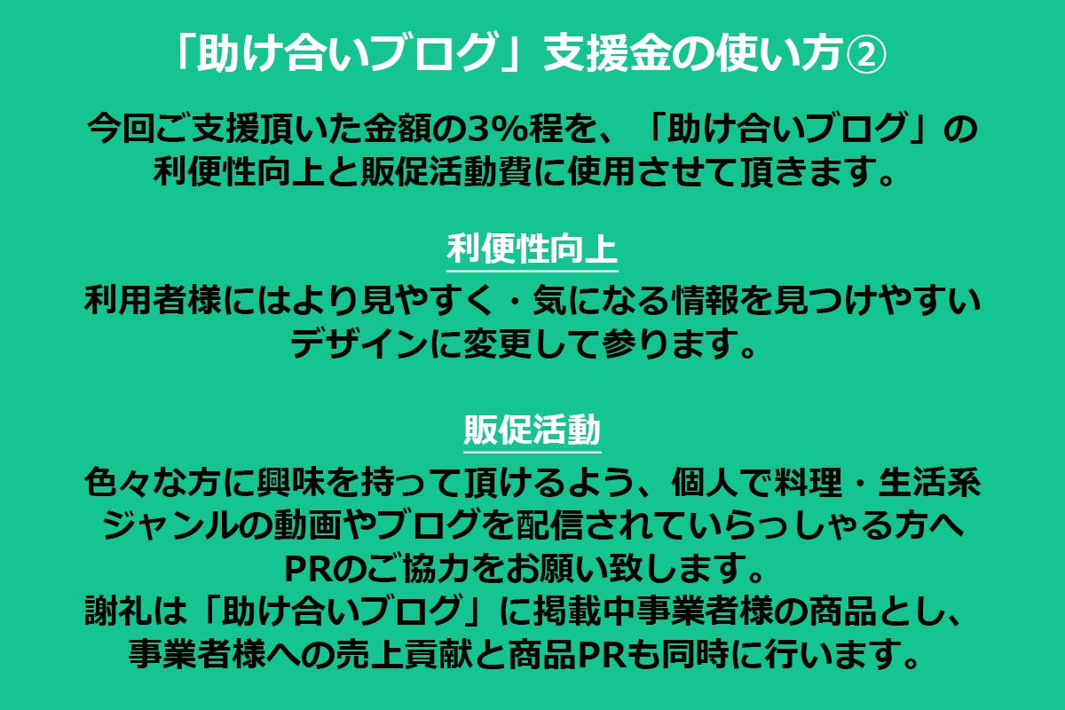 今回ご支援頂いた3%程を利便性の向上・販促広報費に使用させて頂き、それ以外を今回プロジェクトに協力して下さった「助け合いブログ」を利用して下さっている事業者様の商品購入代金として使用させて頂きます。