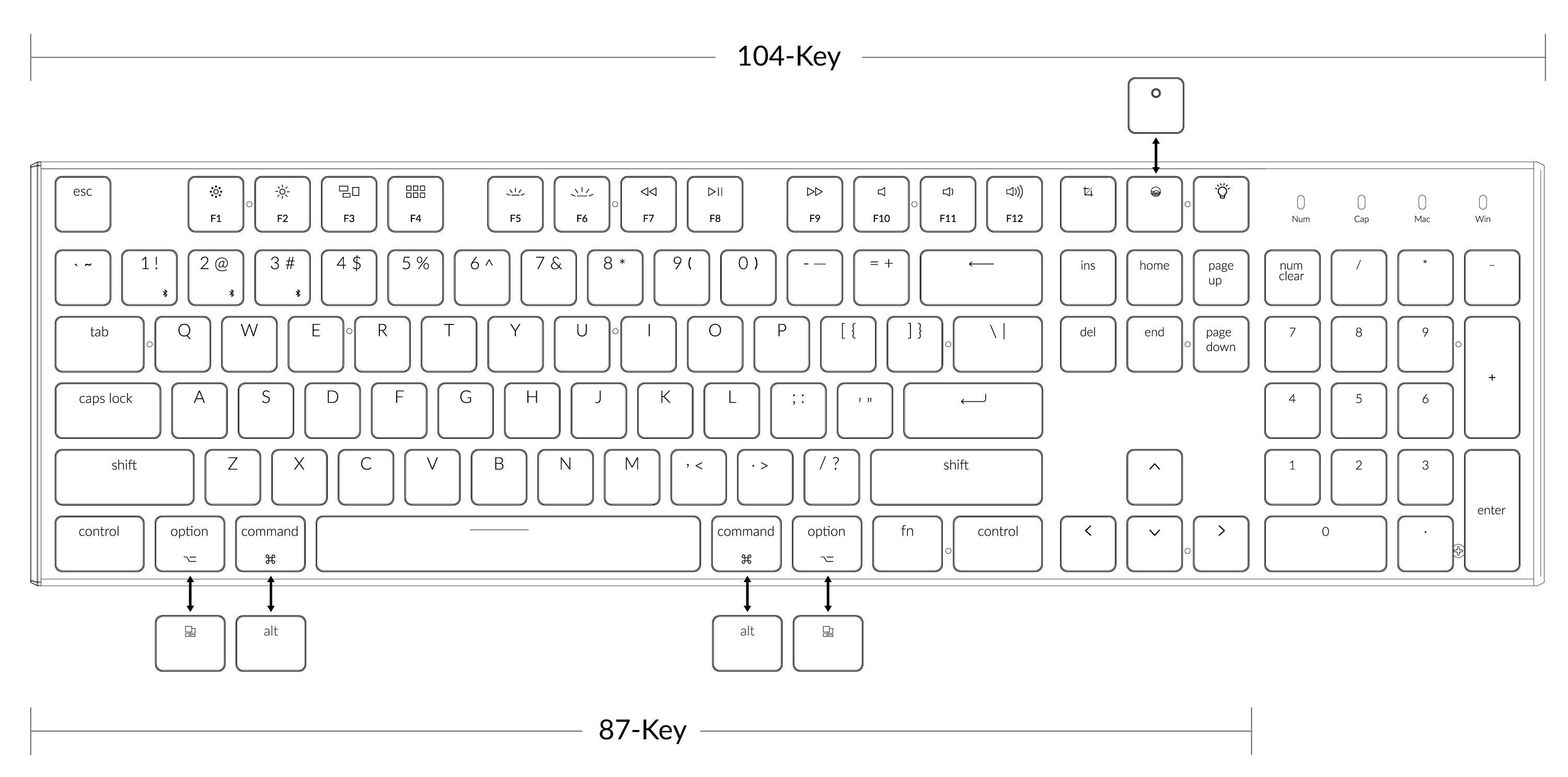 本体スイッチで切り替えられる他、Mac独自の[option],[command],[siri]、Windows独自の[windows],[alt],[coltana]それぞれのキーが同梱されており、自分で付け替えることが可能です。