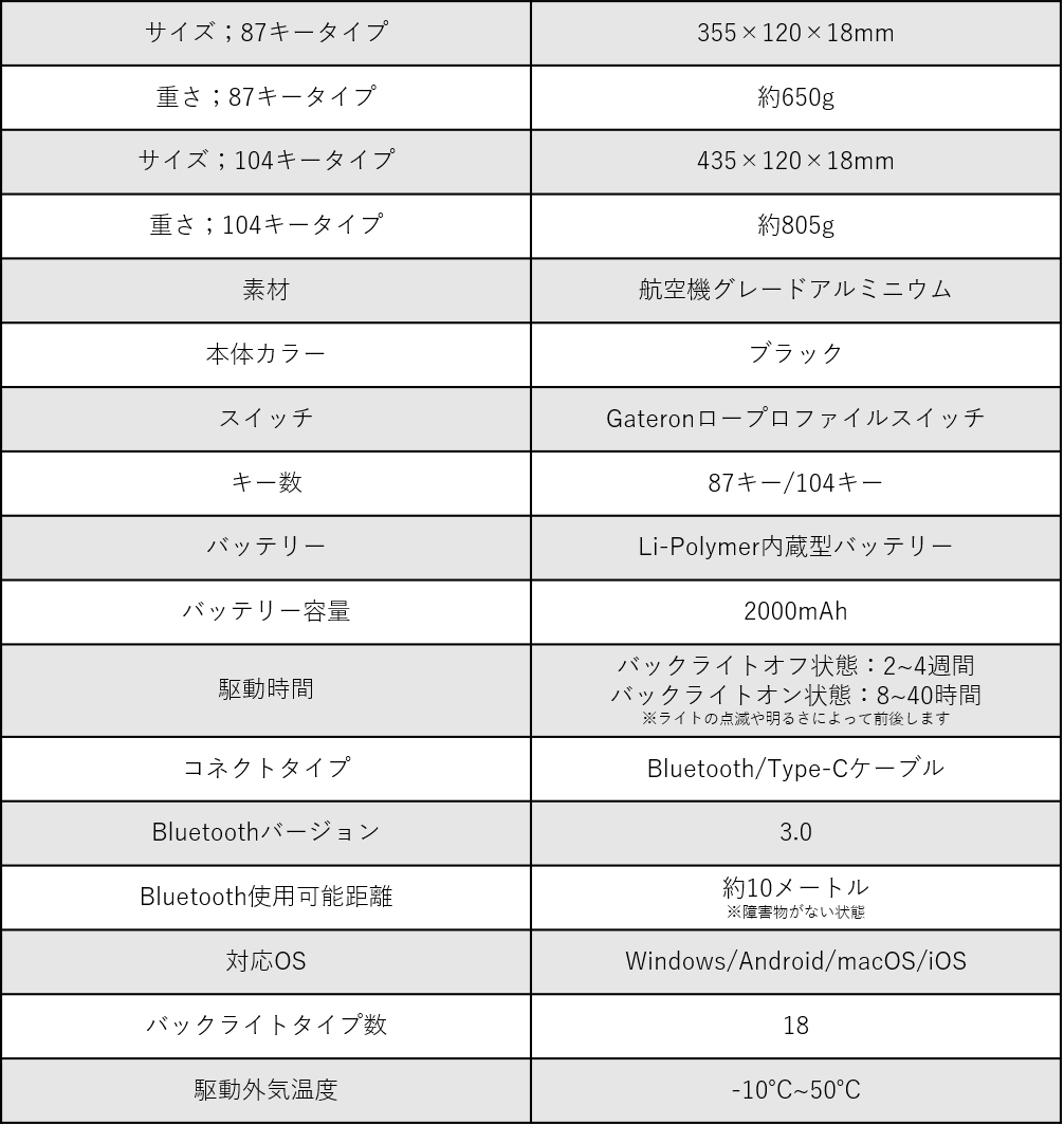 ※104キータイプのバックライトはRGBタイプのみとなります。