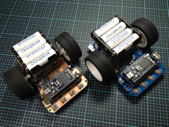 普段、電子工作をしてる人でもあまりプリント基板を自作してる人は少ないほうだと思いますが、プリント基板は自分でも作ることができます。うおーるぼっとR3の試作基板はお手製で作りました。基板メーカーに量産を頼む前に配線等が試せるので、ちょっと手間ですが失敗が事前に分かります。 まずは、プリントパターンを専用フィルム紙に印刷。 両面を合わせて、感光基板に取り付ける。 フィルム紙がピッタリ基板に付く様クランプにセット。 紫外線ライトで感光。製造から新しいプリント基板だったので片面で2分ほど。 25℃ぐらいの現像液に浸せば綺麗にパターンが現れる。 現像した基板をきれいに洗ってから40℃ぐらいに暖めたエッチング液に浸ける。 20分位浸けたら綺麗に剥がれました。 次は穴あけ、小型のボール盤でやるべきですが、手元に無いのでハンドリュータで行いました。 (穴が多いので大変。普段はなるべく穴が少なくなる様に表面実装の部品を使う様に設計するのですが、初心者でもハンダ付けしやすくする様に設計しました。) 次は基板を切り出す。3枚の基板を1枚の感光基板に収めたのでこれもちょっと大変。 (ホーザンのPCBカッターを使いました。基板に限らずいろいろ板が切れるので重宝します。) 最後にフラックスを塗って完成です。 部品をハンダ付けして、サイズ等問題ないことを確認しました。 両面基板の場合、裏と表を繋げる様スルーホールの加工をしますが、スルーホールの加工を行う為の工具とピンは高価なので、細い線で表と裏を繋げています。