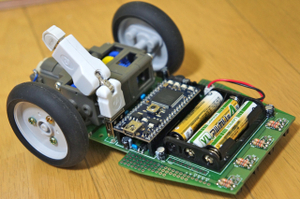 プロトタイプ1号は自動的に走るだけでしたが、このプロトタイプ2号はWiiリモコンで遠隔操作出来る様にしました。使ったマイコンはフィジカルコンピューティングで有名なArduino。WiiリモコンはパソコンとBluetoothで通信して、パソコンとArduinoを積んだプロトタイプ2号がZigbeeという無線通信を行っています。プロトタイプ2号ははんだづけカフェのオープニングイベントや秋葉原のイベントで公開して、たくさんの小さなお友達から大きなお友達まで遊んでもらいました。