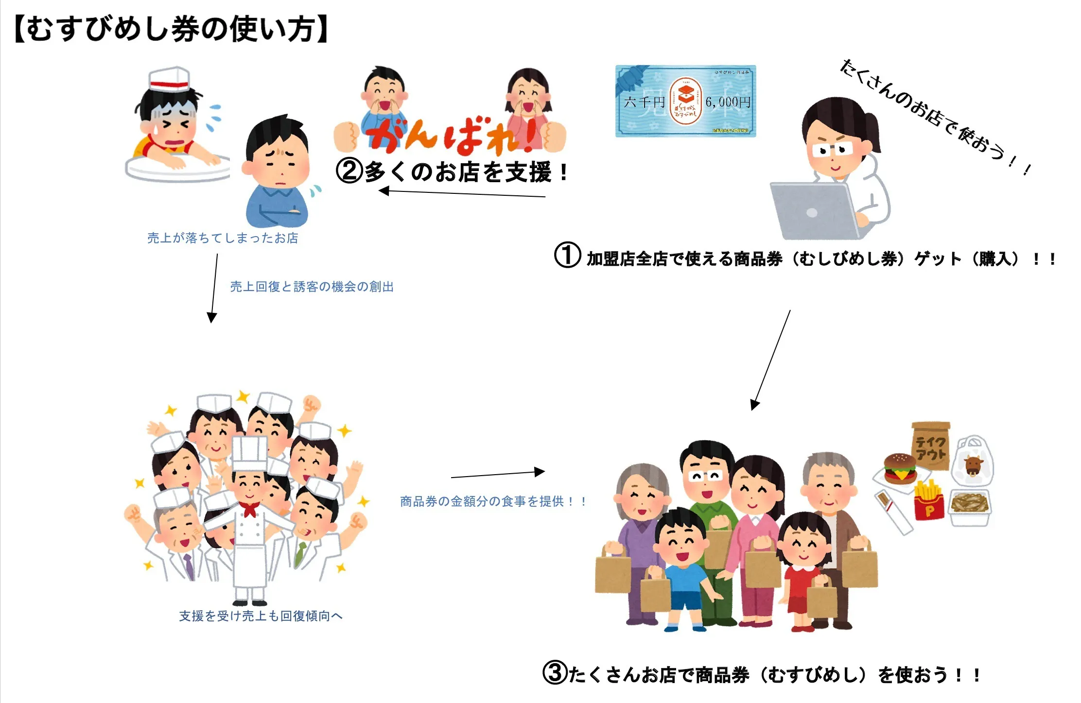 ②加盟店全店舗で使用可能な商品券「通称:むすびめし券」を発行、じっくりと継続した展開で集まった資金をたくさんのお店にお届けします。