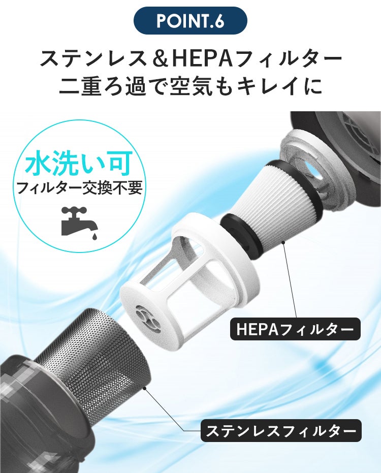 スリムで、収納スペースをとらないので、置き場所は自由。気付いたときに、さっと手に取って使えます。また、吸引力13000Paのハイパワーで、あらゆるゴミや汚れを確実に吸引。お掃除の効率が格段にアップします。