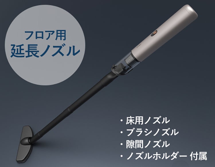 床用ノズル他、ブラシノズル、隙間ノズルと、各ノズルを格納できるノズルホルダーも付属します。