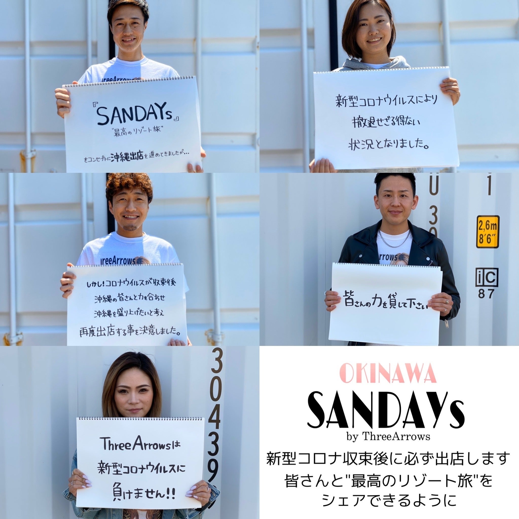 沖縄店の撤退決定後に、ニュースにて観光客減少による大打撃を受けている沖縄の情報が流れ、感染拡大防止の為「今は観光に来ないでください。」感染収束後にまた笑顔で沖縄へ来てください。とお願いする沖縄の方々の姿を見て、一度はこの沖縄店プロジェクトを諦めましたが、SANDAYs="最高のリゾート旅"を提案する私たちだからこそ、今後の沖縄での最高のリゾート旅を提案できるように、沖縄の皆さんと力を合わせて沖縄を盛り上げていきたいと考え、新型コロナ収束後には再度出店する事を決意しました。