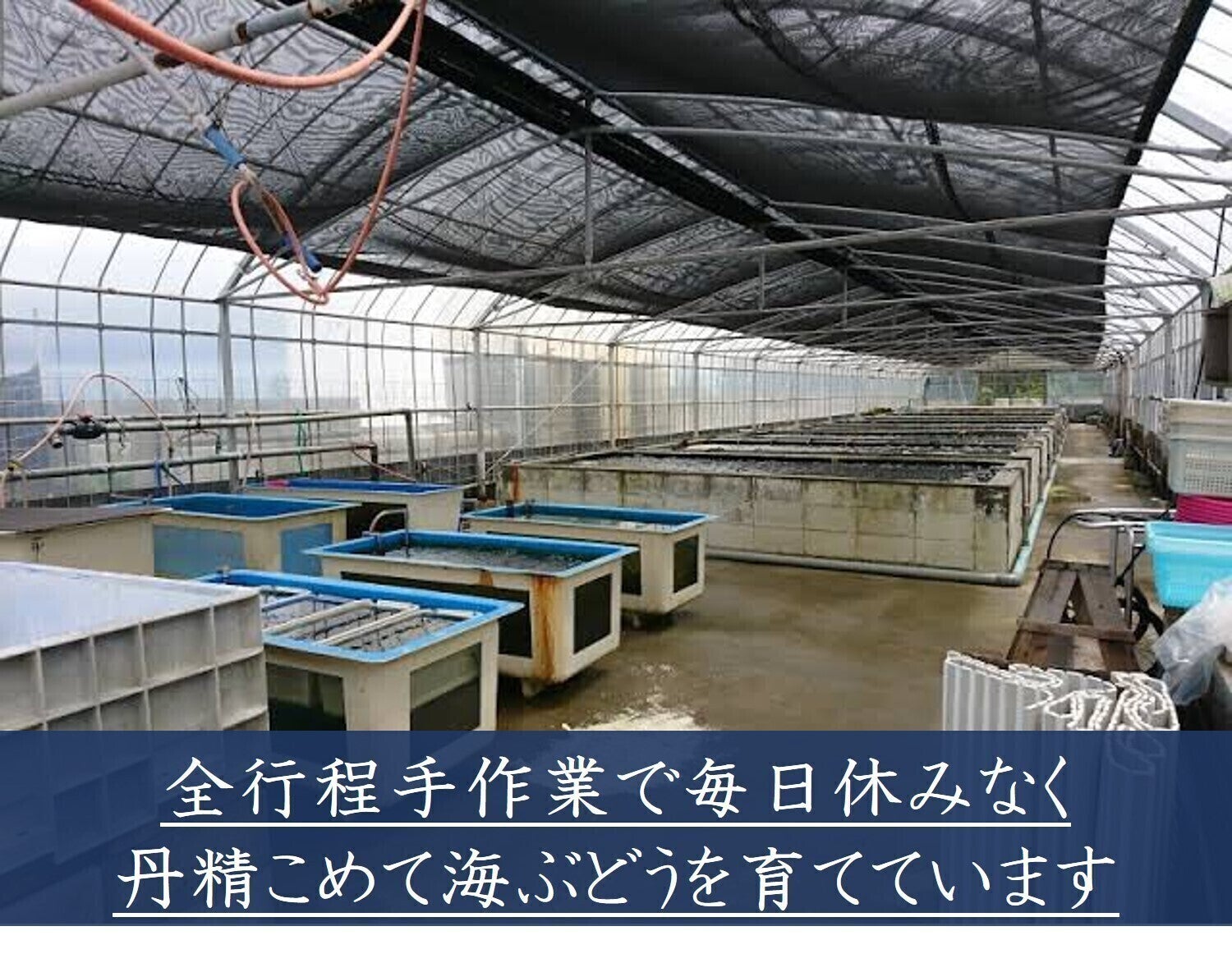 海ぶどうとは大きな単一細胞からなる海藻です。母藻(ぼそう)と呼ばれる軸となる細胞を増殖させ、出荷できるまでの養生期間を通常より少し長くすることで独特な臭みを取り除く工夫を凝らしております。その間の作業や摘み取りまで全て手作業で手間暇かけて大切に育てます。毎日の日照時間などの管理を徹底しております。もちろん化学肥料は一切使用せず丹精込めて作り上げ、日々美味しい海ぶどうを作るための改良を続けています。