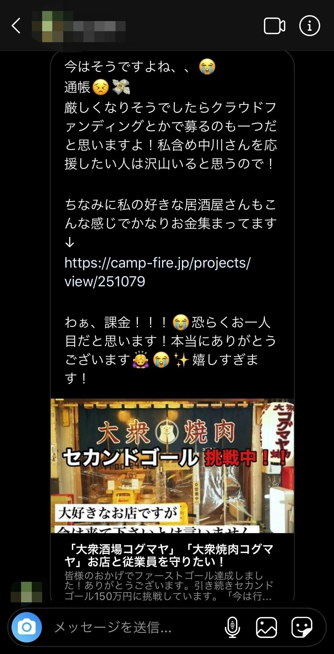 お客様に紹介いただき、背中を押してもらったから、初めてクラウドファンディングに挑戦しようと思えました。正直藁にもすがる思いです笑