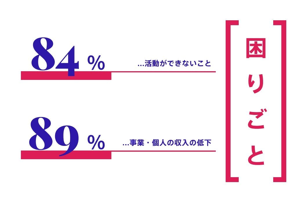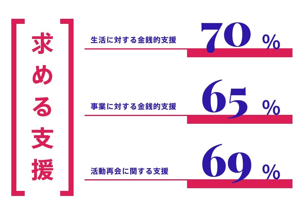 「フリーランスで個人主催をしているとすべての金銭的負担をひとりで負います。小さなイベント経営ですがすでにかなりの額のリハスタや会場、出演者などのキャンセル料を支払います。収入もすべて絶たれ赤字が膨らむばかりです。とてもつらいです。」