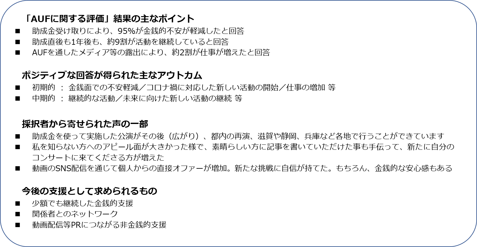2021/08/27 15:50設立、全体統括に関わったケイスリーと、寄付者である新生銀行グループから、Arts United Fund(AUF)の社会的成果のレポートが公表されました。AUFではクラウドファンディング、審査を経て76名への助成を実施いたしました。今回のレポートでは助成直後、一年経過後のアンケート結果をまとめています。AUFの支援活動により、採択者の活動の場が広がるなど、効果が現れています。新型コロナウイルス感染拡大によって表現や活動の場が少なくなることで、アーティストやその制作等に関わるプロフェッショナルは今もなお危機的な打撃を受けています。これからも、レポート公開やインタビュー、課題の抽出を通してフリーランスの芸術文化関係者の力になれればと考えています。基金へのご寄付、ご支援をくださった皆様には、改めて感謝申し上げます。詳細な活動成果に関しては、以下リリース及びレポートをご参照ください。PRTimes: https://prtimes.jp/main/html/rd/p/000000072.000023382.htmlレポート: https://www.k-three.org/post/20210827採択者のインタビュー記事を公開しているnote: https://note.com/artsunitedfund もっと見る