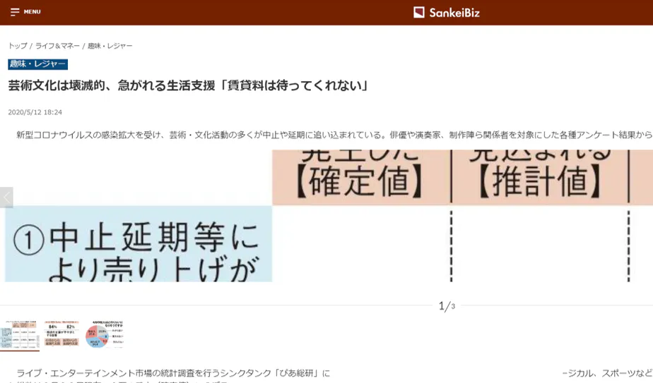 2020年5月12日のSankei Biz「芸術文化は壊滅的、急がれる生活支援「賃貸料は待ってくれない」」に、AUFの基となった、調査結果が掲載されました!