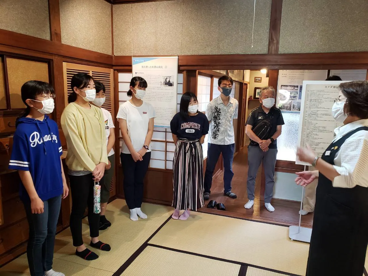 教室でアイスブレイクをしたあと、カナダミュージアムに出かけ、三尾たかえ館長から説明を受けました。
