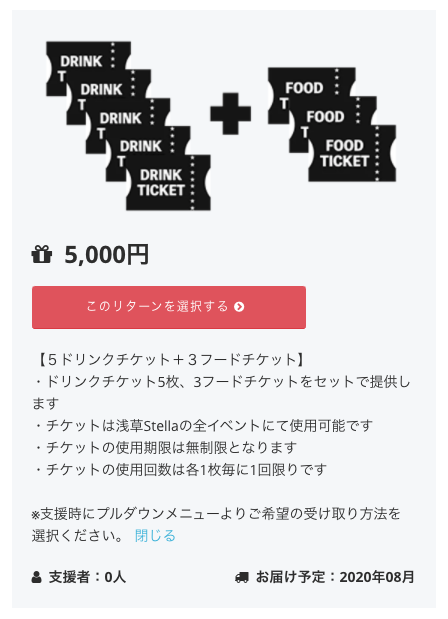 「ドリンクとフードのセットのリターンがあると嬉しい」と言う声が多く寄せられましたので、この度リターンに追加しました!このリターンもイベントに関係なくご使用頂けますので、是非皆さんでAsakusa Stellaの名物グリーンカレーやポテト、そして様々なドリンクにご使用いただければと思います!引き続き、ご支援の程、よろしくお願いします!