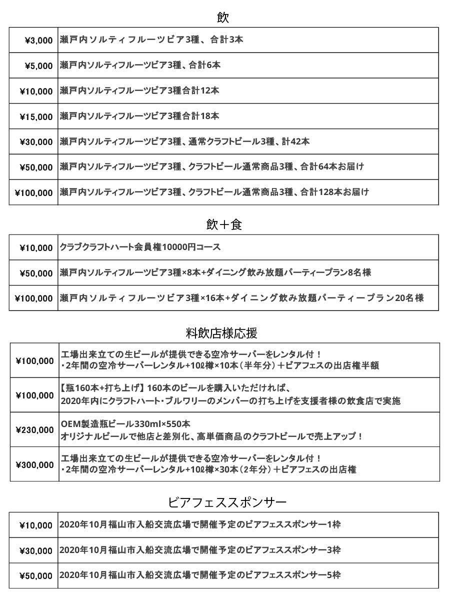 2020/05/21 19:19ご支援いただいた皆様へ瀬戸内果実を使ったフルーツビールで瀬戸内の食と観光を元気に!この題目でクラウドファンディングを開始して、残り44日を待たずに目標金額500,000円を達成することができました。ご支援いただいたことに感謝いたします。そして必ず「瀬戸内の食と観光を元気に!」というミッションを遂行してまいります。 残り1か月以上クラウドファンディングがありますので、もちろんネクストゴールを設定しなくてはいけません。10月4日、5日の土曜日、日曜日の2日間にわたり、福山市の入船交流広場で、「福山ビールフェスタ&フードフェス&地産地消フェア&音楽フェス」の開催を予定いたします。ここから1か月は、瀬戸内の食と観光を元気に!のミッションの一環として、ご支援いただいた資金は、このフェスの成功のための費用に充てます。そのため、ネクストゴールの目標は1,000,000円とさせていただきました。私どもは、地域の素材を使い、地域へ販売する地域密着型ブルワリーです。地域の皆様が元気でなければ成り立ちません。フードフェスでは、地元飲食店へ発表の場を提供します。地産地消フェアでは、安全・安心で新鮮な地元農産物の魅力を広く知っていただく場として、直売所を設けます。音楽フェスでは、ジャズやクラシックなど様々な音楽家の方たちの発表の場を設けます。そして最後になりましたが、私どもの瀬戸内ソルティフルーツビアを10月の青空の下、のど越し爽やかに楽しんでいただき、訪れた皆様のストレスを開放し、元気になっていただきたきたい。心が晴れて内側から健康になるイベントにしていきたいと考えております。※参加費無料の、お好きな時間に来てお好きな時間に帰ることのできる開放イベントです。※お子様も楽しめるように企画し、ご家族でご参加いただけるイベントにいたします。新型コロナウィルスの影響で、多くの私どものパートナーである生産者や飲食店、音楽家の方たちが苦しい立場に追い込まれています。でも、皆さん知恵と工夫を凝らして頑張っておられます。そんな皆さんと共同してイベントを発起いたします。是非応援いただければと思います。引き続きご支援、応援のほどよろしくお願いいたします。 クラフトハート・ブルワリー 一同より もっと見る