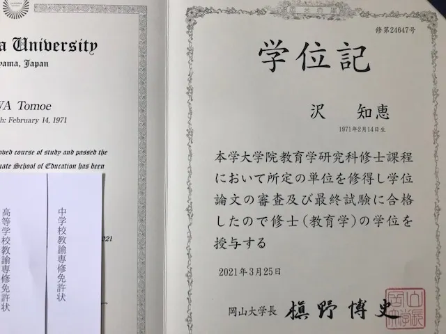 2021/03/31 12:062021年3月25日、岡山大学大学院教育学研究科を無事修了しました。たくさんのお祈りとお支えをありがとうございます。新型コロナウイルス感染症対策をとり、学生のみ参加で、午前と午後に分かれて行われた学位授与式では、こみあげてくるものがありました。いっしょに入学し、去年修了したほとんどの仲間は、式がありませんでした。私は仕事をしながらの長期履修だったため、式に出ることができました。学業を断念せざるをえないと思った去年の春を思うと、夢を見ているようです。中学高校の音楽の教職免許も取ることができました。教育実習も行きました。いい出会いと学びがたくさんありました。感謝の気持ちでいっぱいです。岡山大学のサイトに、私の論文について書かれた新聞記事やインタビューへのリンクがあります。よろしければ、ごらんください。看板娘ならぬ「看板おばさん」とか、教授にからかわれています。光栄です。岡山大学大学院教育学研究科のサイトクラウドファンディングで支えてくださったみなさまには、4月中にリターンをお送りする予定です。クラウドファンディングはしなかったけれど、私の修士論文「日本の公立ハンセン病療養所の園歌―抑圧と解放のはざまで生まれた音楽―」を読みたいという声も届いています。ありがとうございます。論文をもとに、読みやすく書き直して本にしたいと願っています。首を長くしてお待ちください。論文もいずれ公開するつもりです。今後はうたと研究の両輪で活動していきます。ハンセン病療養所の音楽文化は、知れば知るほど豊かで奥が深いです。みなさんが生きた証を記録にのこし、伝えていきたいです。コロナ禍がおさまったら、全国の療養所でコンサートをすることも考えています。そんな日が一日も早く来ますように。去年できなかった20回目の「大島青松園コンサート」は、無観客で配信することも視野に入れています。最新の情報は、私の公式サイトやSNSでご確認ください。それから、みなさまのお近くで、ハンセン病療養所の音楽について「レクチャー&コンサート」をご希望の方がいらっしゃいましたら、お声がけください。規模や予算など、相談に応じます。お問い合わせは沢知恵の公式サイトよりまだまだ不安と緊張の日々がつづきますが、どうかお元気でおすごしください。またコンサートでごいっしょできる日を心待ちにしています。春です!感謝して。2021年3月31日 沢知恵 もっと見る